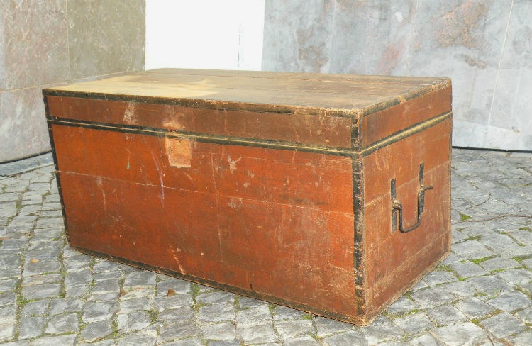 Herdei este baú da minha sogra. Ficou vários anos guardado no sótão da casa do cunhado esperando meu regresso a Brasília. Minha ideia era reformá-lo, mas não consegui fazer nada nos anos que lá morei e veio na mudança no mesmo estado que recebi. Não foi por falta de vontade ou de tempo, e sim por nenhum dos projetos que desenhei me convencer completamente. No primeiro esboço pensei em fazer uma mudança completa, pintar tudo com flores e folhas, usando as cores preferidas da antiga dona, em outro momento pensei em motivos simples na frente e dos lados, mas nada avançava. Só agora pecebi que não podia fazer a pintura pensando na minha sogra, infelizmente já não posso agradá-la com algumas flores pintadas, e o que interessa para a dona atual, eu, são as recordações que seu estado velho e gasto vão buscar na minha memória. Por isso a recuperação total ficou só na parte interna, que estava em péssimo estado, mas mantive o material de origem: Papel, usei um mapa da Itália bem gasto e cheio de anotações de viagens maravilhosas. Na parte externa deixei a pintura original, só limpei a grossa camada de poeira e troquei a fechadura quebrada por outra antiga e mais bonita. Agora além das lembranças o velho baú também guarda cobertores e edredons.