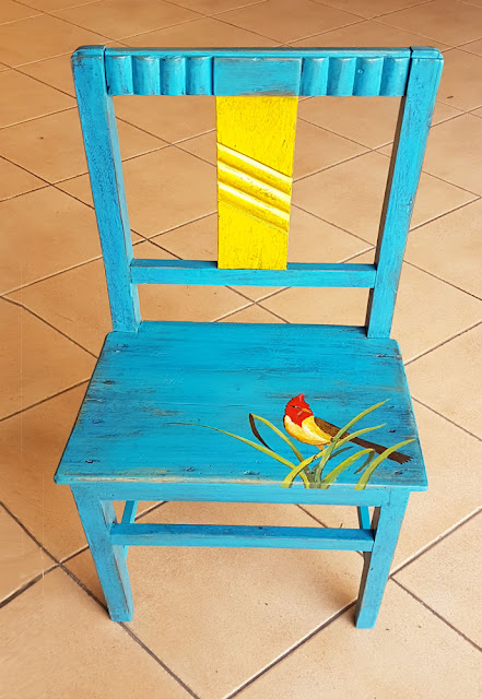 Olá Regina, seus trabalhos sempre me encantam. Dos mais elaborados aos mais simples. Adorei que vc tenha deixado o que alguém algum dia fez na cadeira em azul e amarelo, mas tenha colocado "sua marca" com o pássaro. Passou de comum a extraordinária. E me parece que se tornou peça total flex andando pela casa. Gosto muito de a ver como criado mudo! Beijos e bom fim de semana.