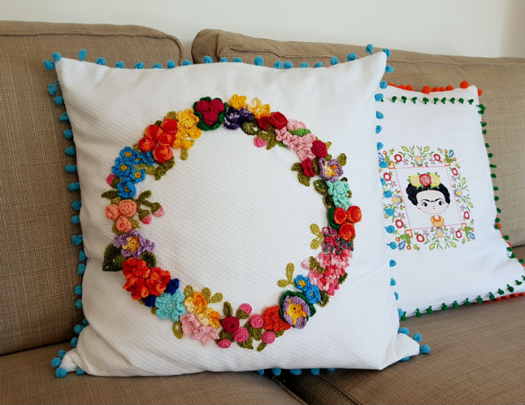 Almofada com guirlanda de crochê