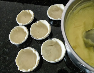 Com a ajuda de um rolo abra a massa bem fininha. Corte em circulos e forre forminhas de empada. (Usei a massa que sobrou dos cortes circulares, fui juntando os pedacinhos até cobri o fundo da forminha).