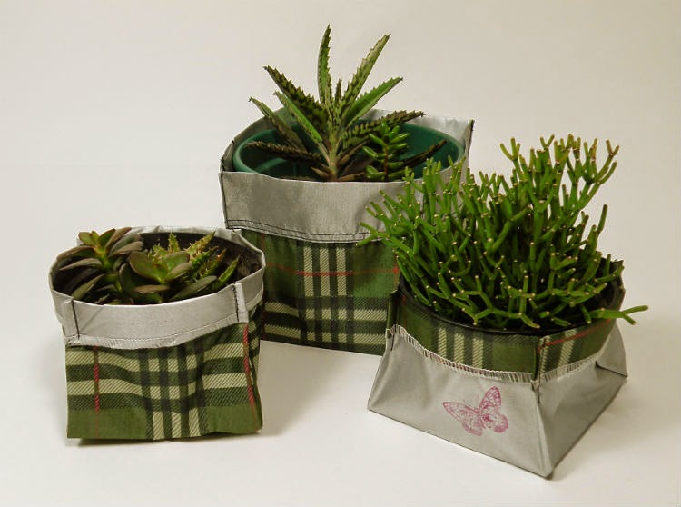 Comecei a cuidar de suculentas por acaso e hoje tenho vários tipos. É fácil cultivar e sempre tenho várias mudas prontas. Os vasinhos abaixo irão morar na casa de amigos que também gostam de suculentas. Para acompanhar as lindinhas vai junto um pé de manjericão novinho, também filho do meu quintal. Para embalar os vasos aproveitei o tecido de um guarda-chuva quebrado e fiz estes simpáticos cachepots, como o tecido é impemeável não deixa a água vazar.